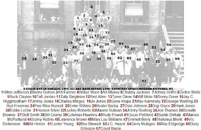 1 Hilton Jefferson 2 Benny Golson 3 Art Farmer 4 Wilbur Ware 5 Art Blakey 6 Chubby Jackson 7 Johnny Griffin 8 Dickie Wells 9 Buck Clayton 10 Taft Jordan 11 Zutty Singleton 12 Red Allen 13 Tyree Glenn 14 Miff Molo 15 Sonny Greer 16 Jay C. Higginbotham 17 Jimmy Jones 18 Charles Mingus 19 Jo Jones 20 Gene Krupa 21 Max Kaminsky 22 George Wettling 23 Bud Freeman 24 Pee Wee Russell 25 Ernie Wilkins 26 Buster Bailey 27 Osie Johnson 28 Gigi Gryce 29 Hank Jones 30 Eddie Locke 31 Horace Silver 32 Luckey Roberts 33 Maxine Sullivan 34 Jimmy Rushing 35 Joe Thomas 36 Scoville Browne 37 Stuff Smith 38 Bill Crump 39 Coleman Hawkins 40 Rudy Powell 41 Oscar Pettiford 42 Sahib Shihab 43 Marian McPartland 44 Sonny Rollins 45 Lawrence Brown 46 Mary Lou Williams 47 Emmett Berry 48 Thelonius Monk 49 Vic Dickenson 50 Milt Hinton 51 Lester Young 52 Rex Stewart 53 J.C. Heard 54 Gerry Mulligan 55 Roy Eldgridge 56 Dizzy Gillespie 57 Count Basie.
